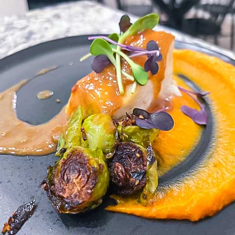 Sweet miso sauce, sweet potato puree, Brussels sprouts.